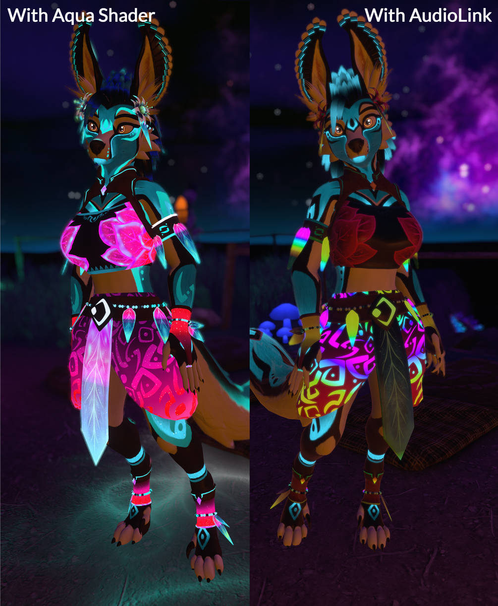 Comes with two base texture designs (mainly focusing on the chest design), blendshapes to match most bodyshapes to the main body, and guides for use and Aqua Shader settings. Also shader masks to use for the Aqua Shader!
