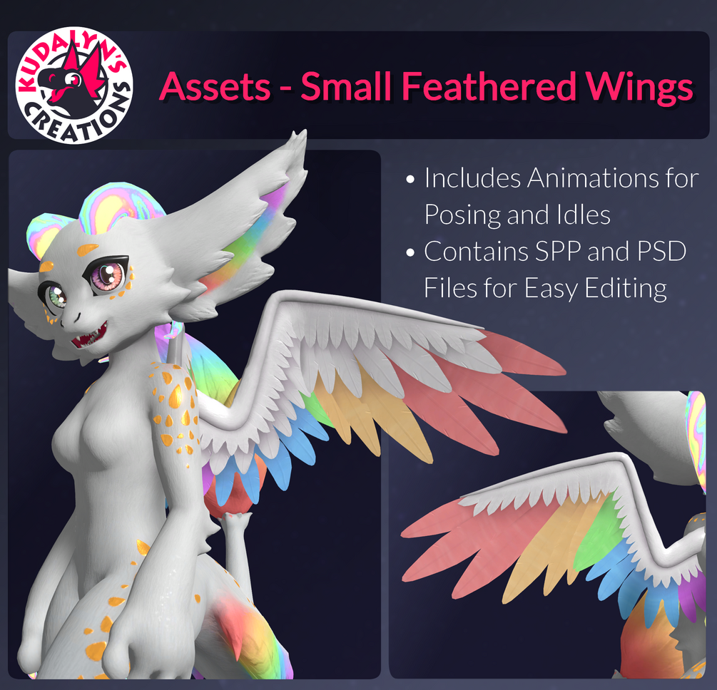 Some feathered wings! Included is a guide on how to attach/use, a Unitypackage with prefab, textures, and SPP and PSD files.