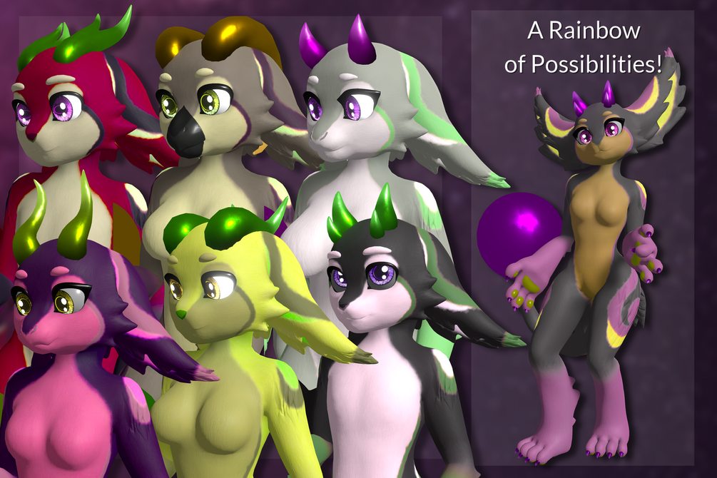 (Includes tail control, ear control, expressions menu, body features and shape controls, muzzle shape and texture changes controls, horns/tail type menus, hue slider for body and tail/horns.)